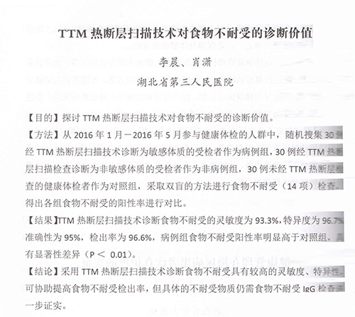 大會論文匯編收錄了湖北省第三人民醫院編寫的《TTM熱斷層掃描技術對食物不耐受的診斷價值》,研究結果顯示采用TTM熱斷層掃描技術診斷食物不耐受具有較高的靈敏度、特異性。