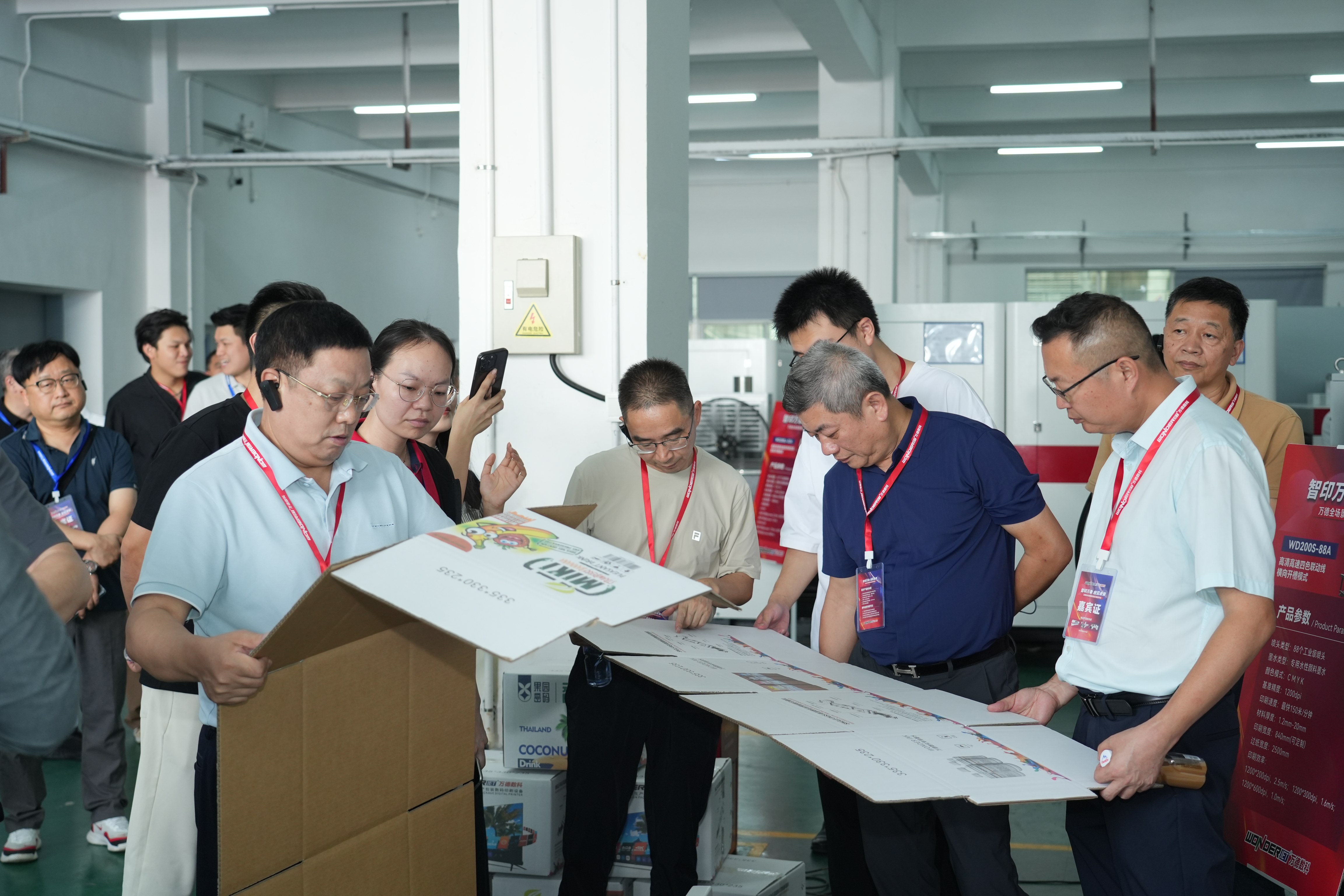在WD200J-32A聯動線演示區,設備實現豎向開槽與壓線一氣呵成,精度控制至毫米級,引發客戶關注;在WDRUV200-60A UV機前,涂布紙樣品的高飽和度與防水耐高溫特性令參觀者頻頻稱贊;而WD250J-18A白墨掃描機則通過現場切換白墨通道,完美解決了黃板印刷中色彩偏差的痛點。整體觀摩過程中,嘉賓們紛紛表示“眼見為實”,對數碼設備在替代傳統工藝中的潛力有了更深認知。